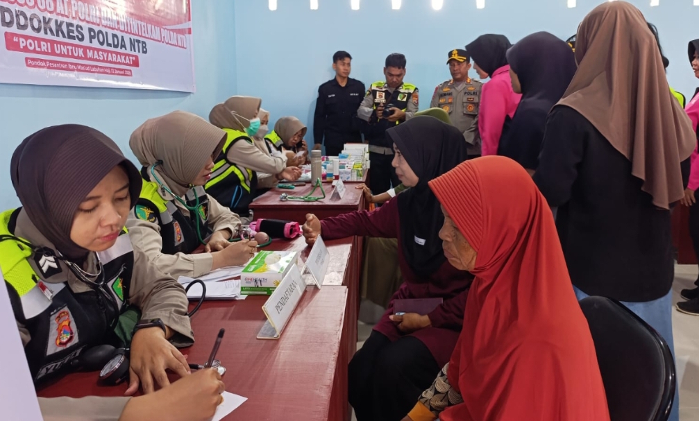Hadir langsung dalam kegiatan itu Ketua Bhayangkari Polda NTB, Ny. Uty Edy Murbowo, yang turut menyaksikan jalannya pemeriksaan kesehatan sekaligus penyerahan bantuan bahan pokok kepada masyarakat dan kedua pondok pesantren.