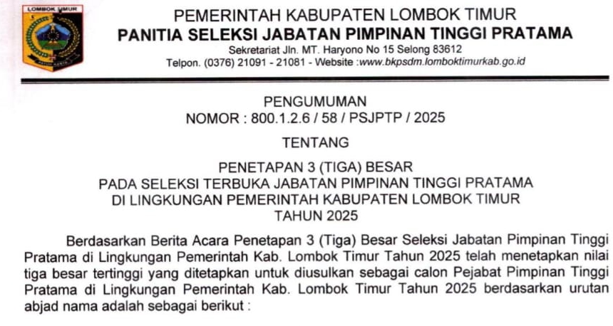 LOMBOK TIMUR | FMI – Panitia seleksi (Pansel) resmi mengumumkan tiga besar hasil seleksi terbuka jabatan pimpinan tinggi (JPT) pratama di lingkingan pemerintah kabupaten Lombok Timur tahun 2025.